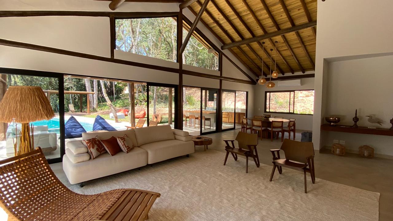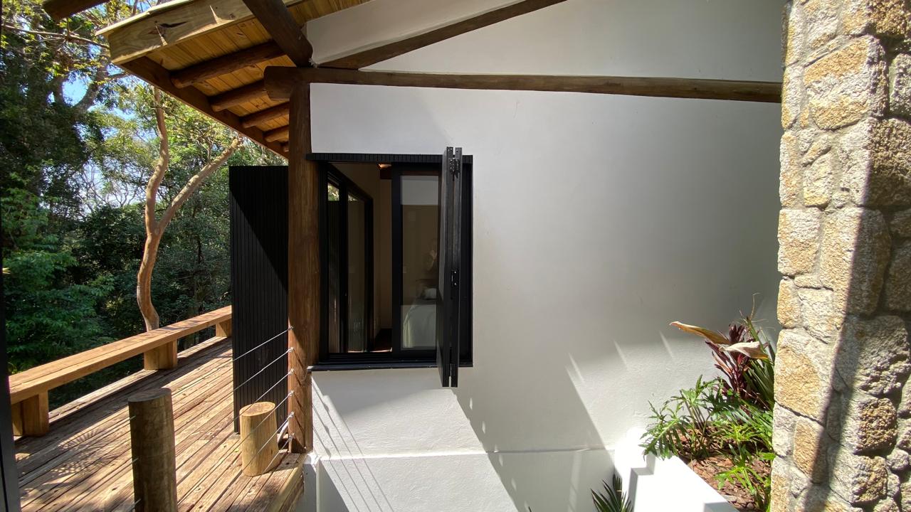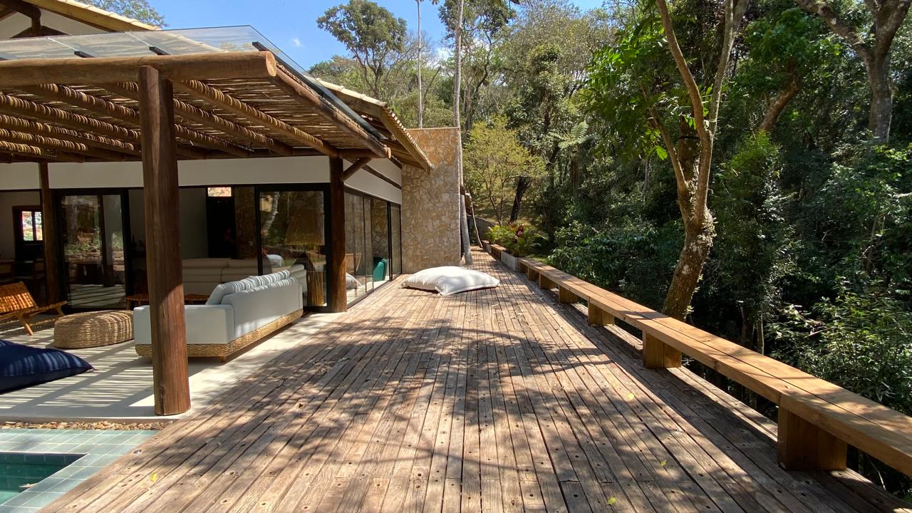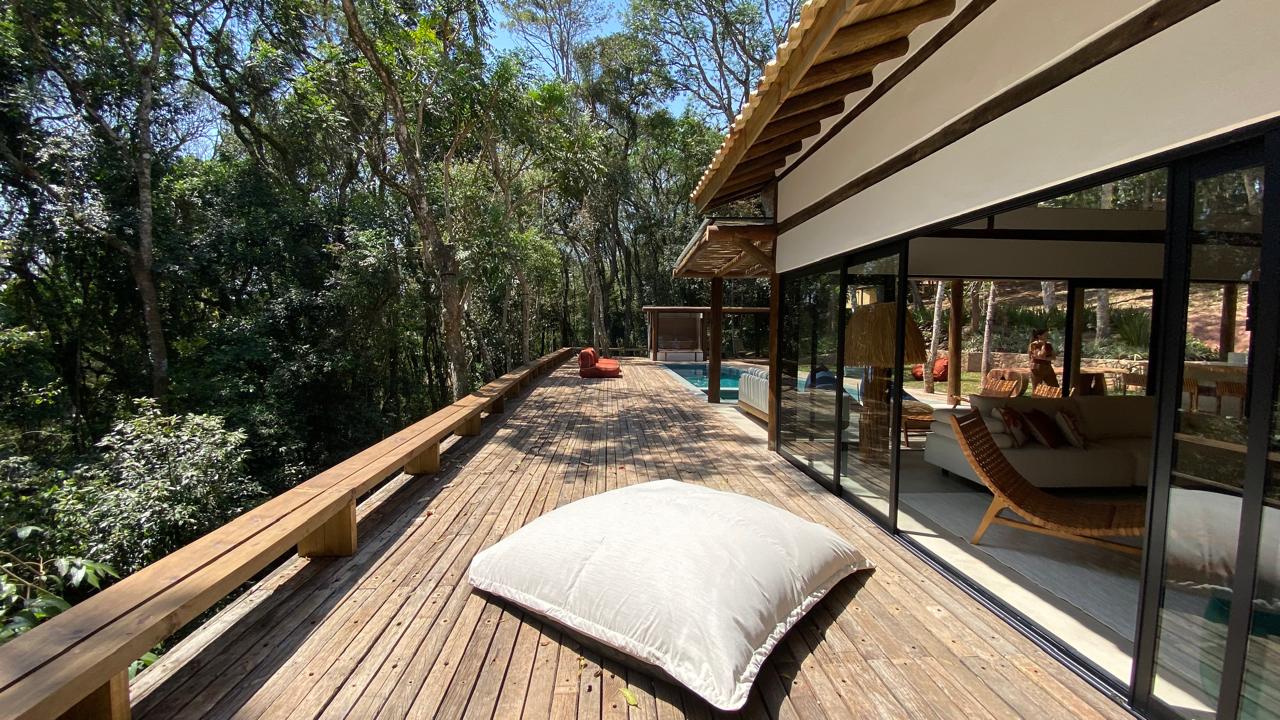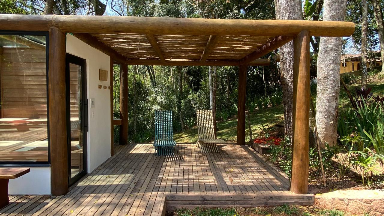 Casa construída em eucalipto roliço tratado, harmoniosamente inserida em um terreno cercado pela vegetação nativa.