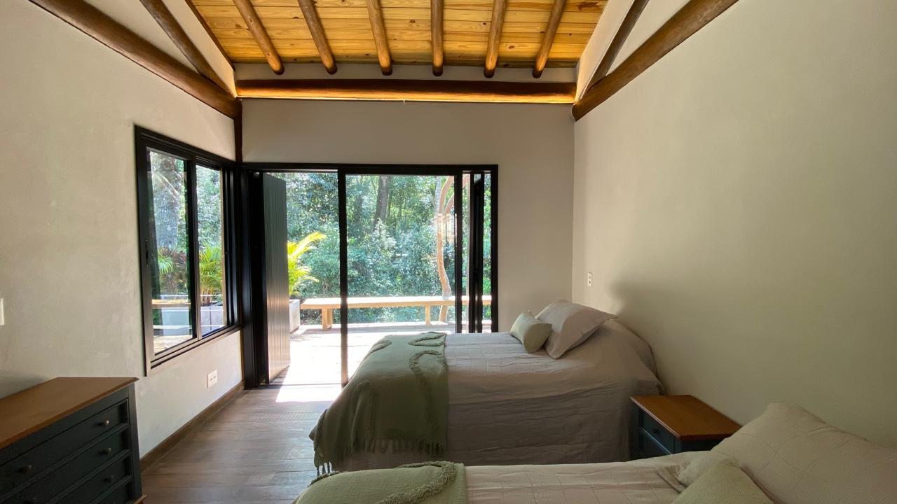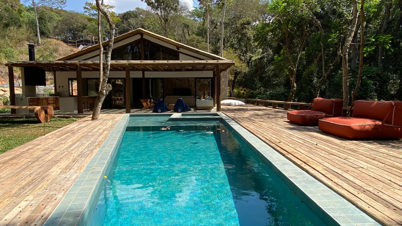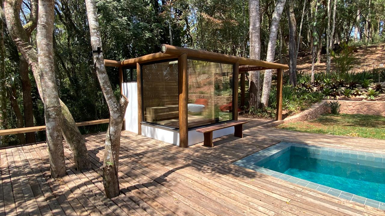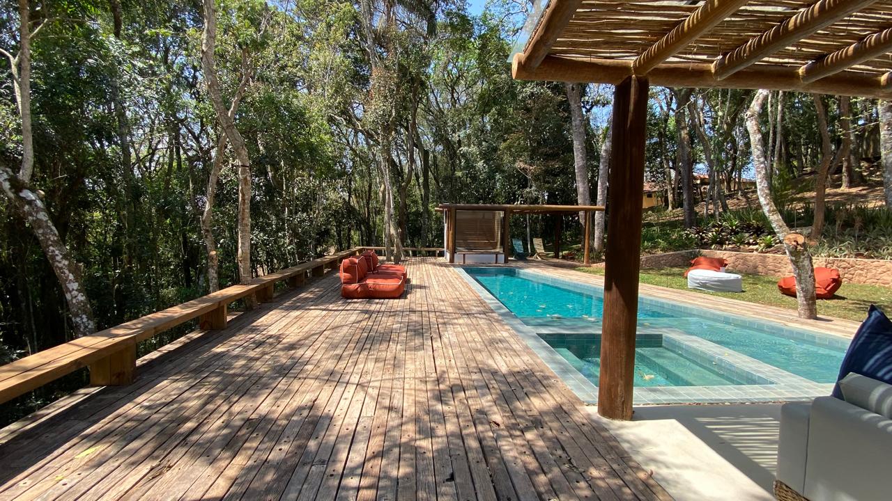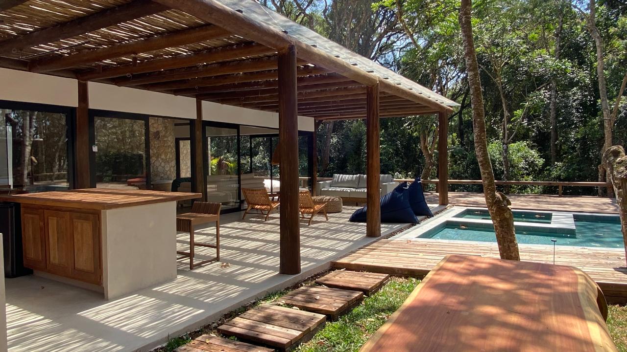 Casa construída em eucalipto roliço tratado, harmoniosamente inserida em um terreno cercado pela vegetação nativa.