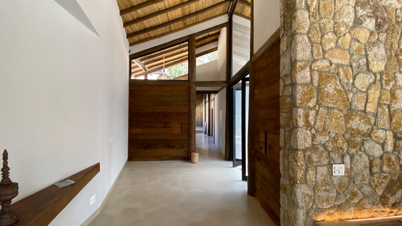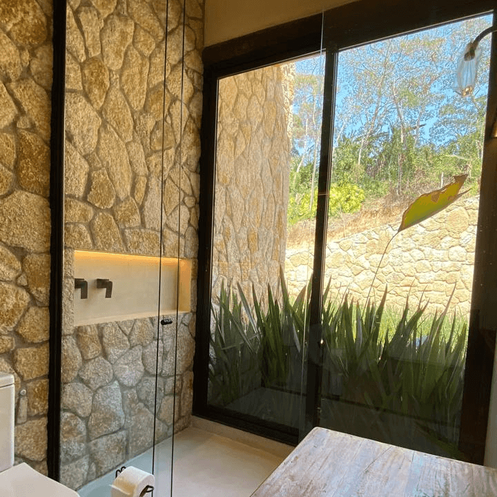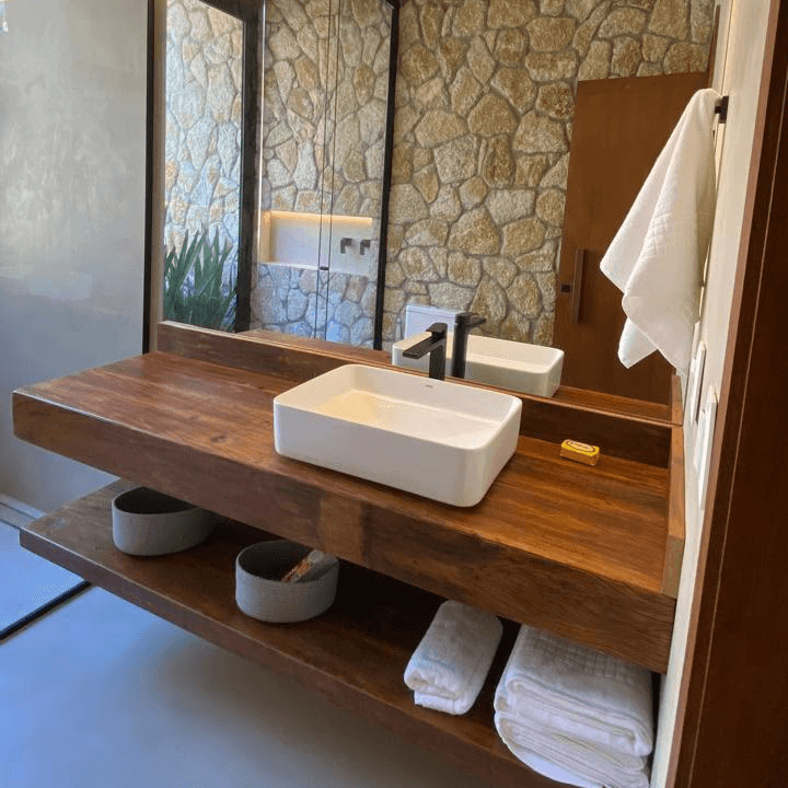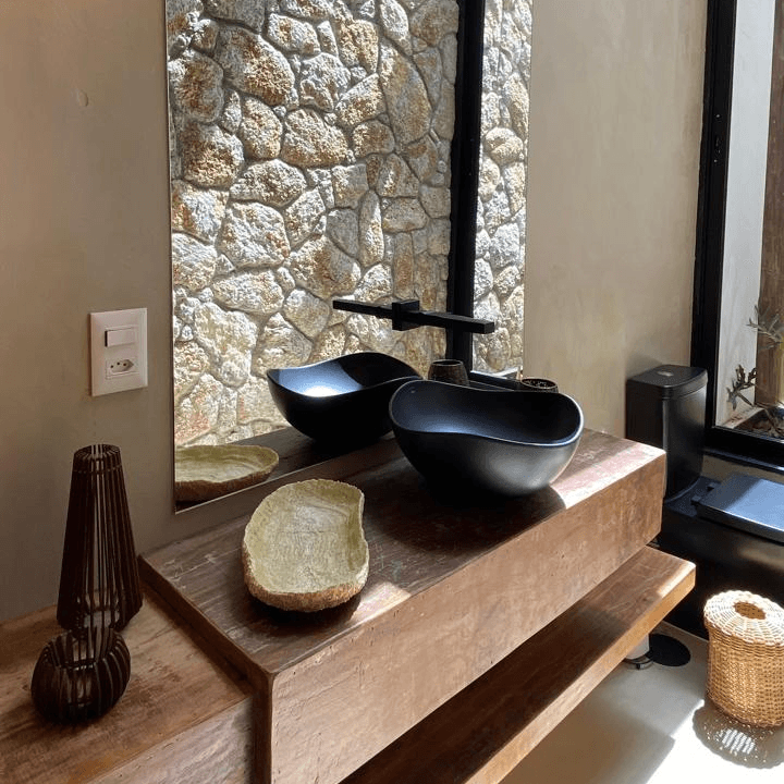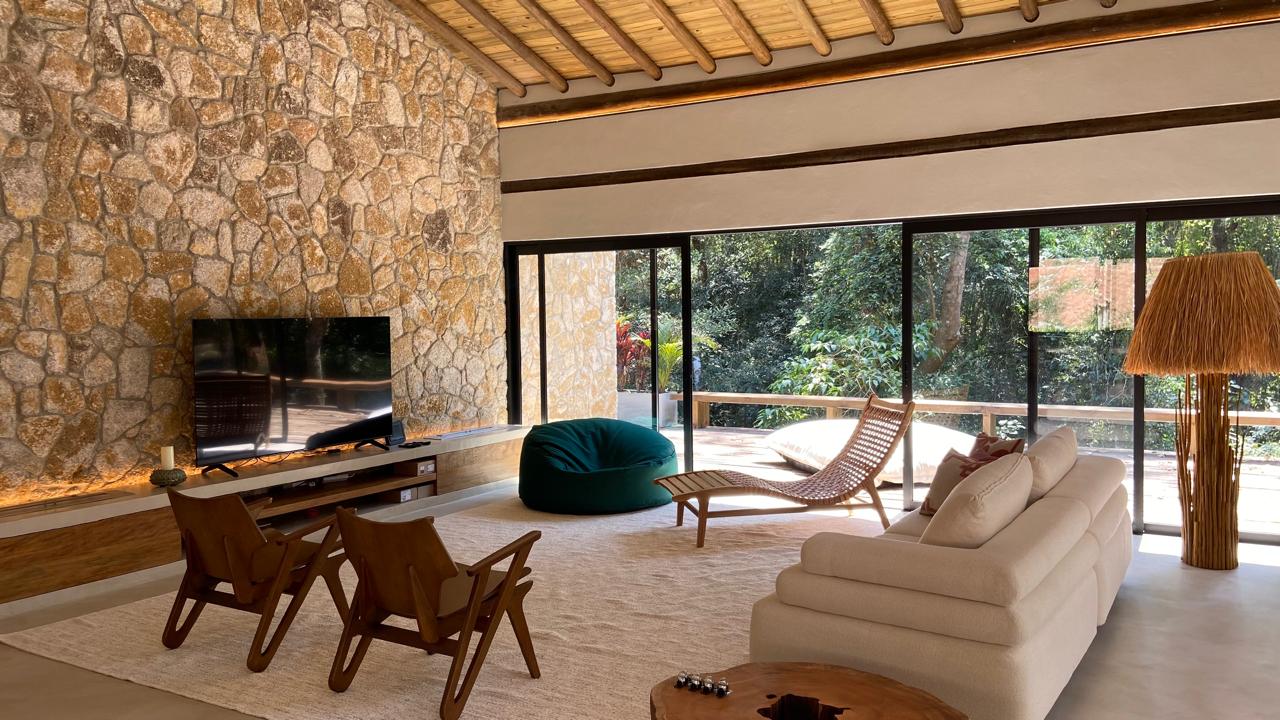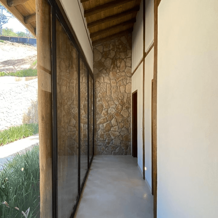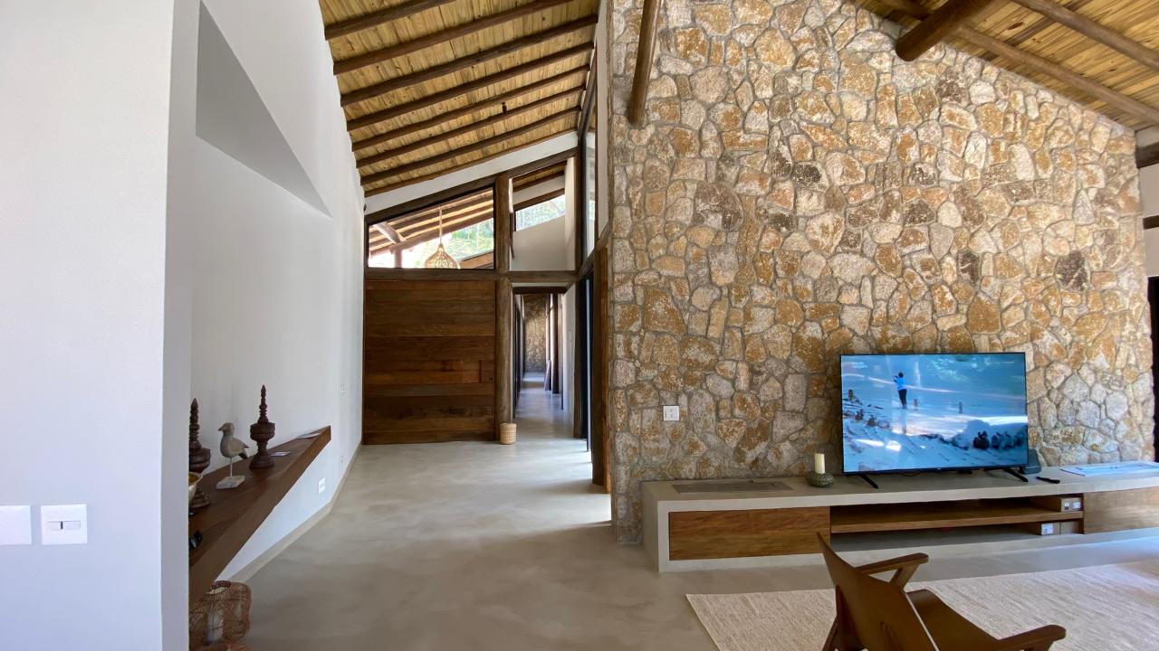 Optou-se pelo uso de materiais naturais, como pedra bruta em paredes e muros, e tecnocimento nos pisos e paredes, que apresenta acabamento contínuo e texturas suaves que criam movimento.