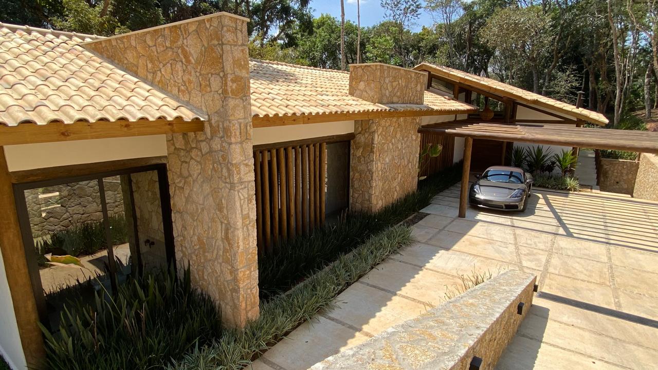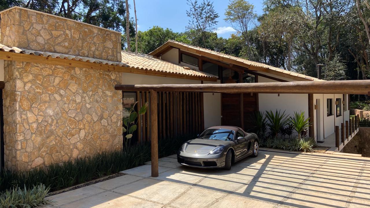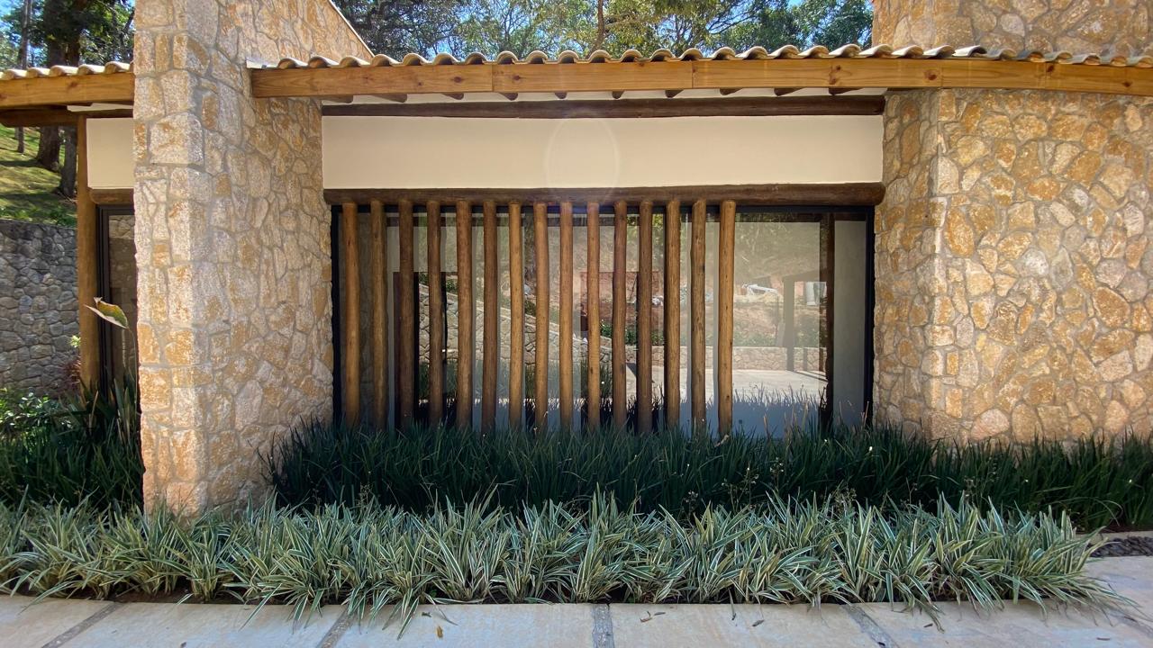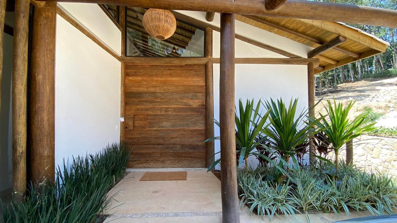 Casa construída em eucalipto roliço tratado, harmoniosamente inserida em um terreno cercado pela vegetação nativa. Optou-se pelo uso de materiais naturais, como pedra bruta em paredes e muros, e tecnocimento nos pisos e paredes, que apresenta acabamento contínuo e texturas suaves que criam movimento. Em função do relevo acidentado, adotou-se como solução construtiva, a implantação de decks em cruzetas apoiadas em pilotis, preservando o traçado original do terreno e minimizando intervenções na paisagem.