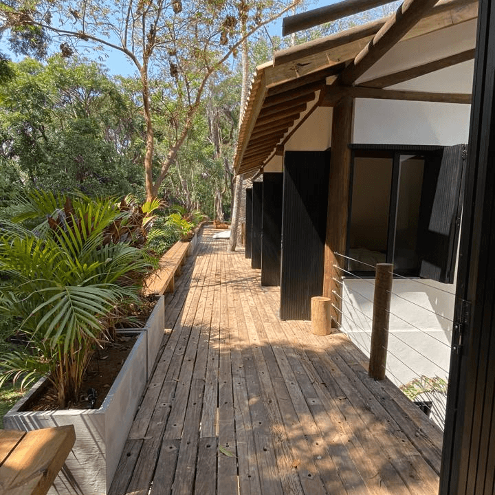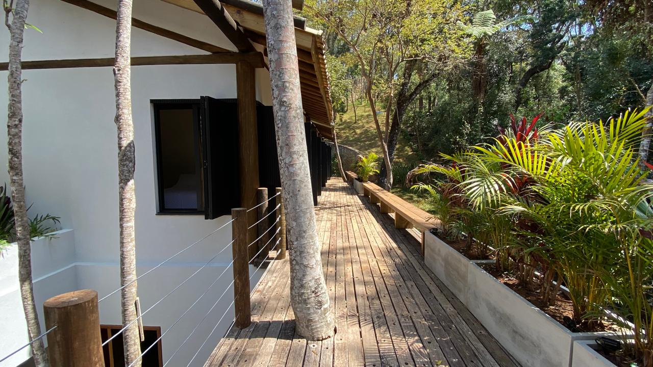 Em função do relevo acidentado, adotou-se como solução construtiva, a implantação de decks em cruzetas apoiadas em pilotis, preservando o traçado original do terreno e minimizando intervenções na paisagem.