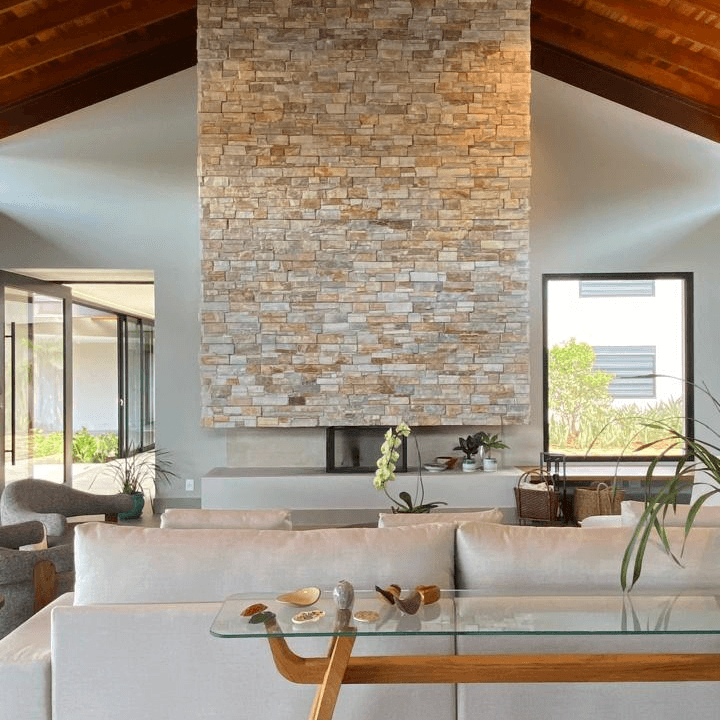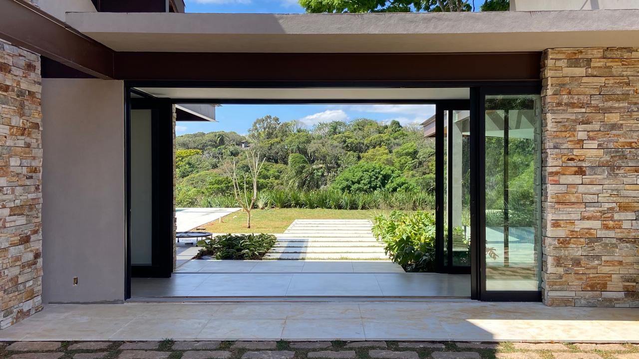 Essa passarela, elemento central do projeto, não apenas une as duas alas da casa, como também, ao ser aberta, transforma-se em um pórtico que emoldura e se abre para um exuberante maciço verde.